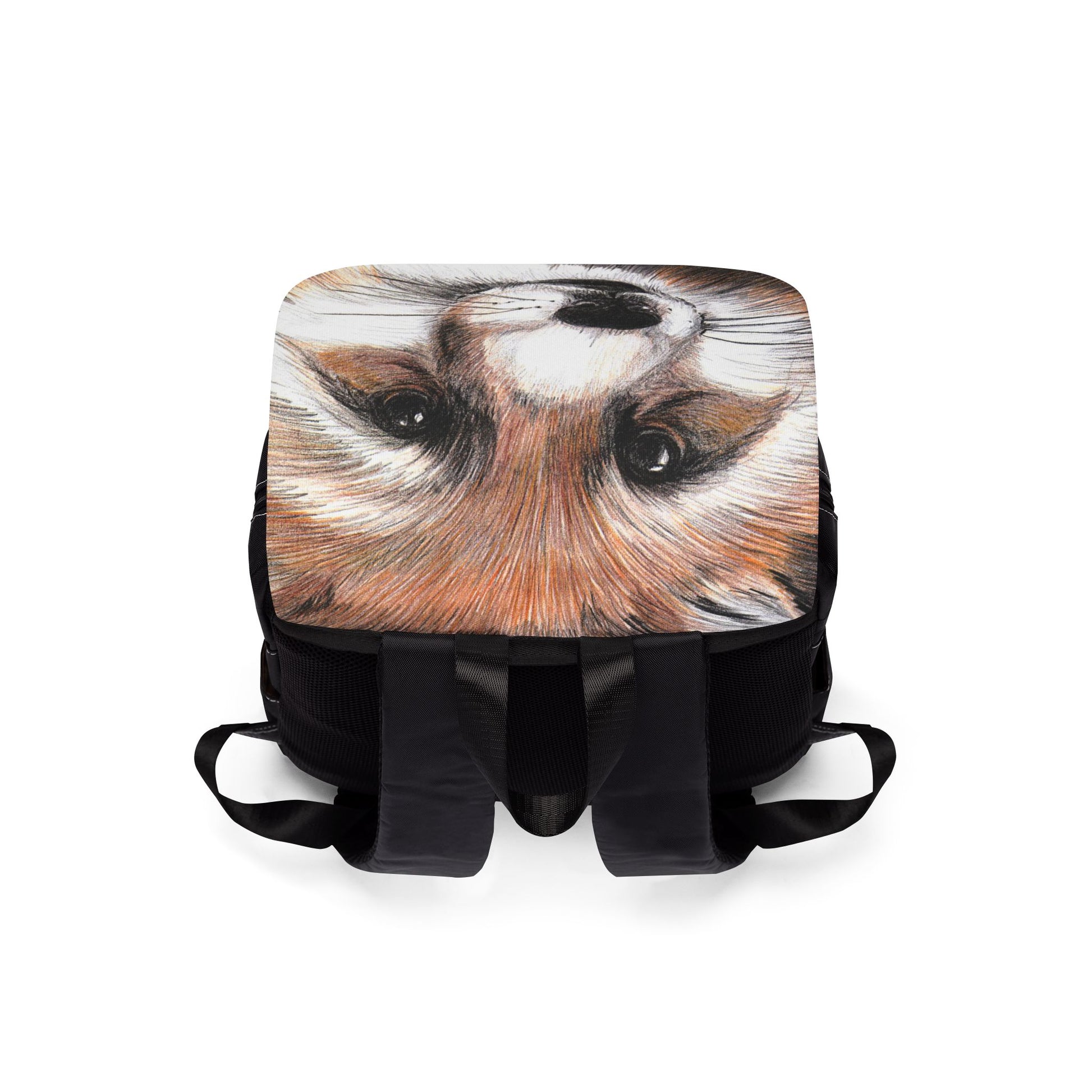 This canvas shoulder backpack brings together rugged utility and a touch of wildhearted charm. The roomy interior and six thoughtfully placed compartments keep a daily commute, a study session, or a weekend walk organized — laptop sleeve, inside pockets, front zip pocket with buckle, and twin side bottle holders. The padded mesh back and adjustable straps make longer carries easier, while the flap with strap clasps and durable Oxford canvas stand up to everyday wear. The black base and interior keep the look grounded, while the illustrated fox face on the flap adds personality and quiet whimsy. It’s for people who carry essentials deliberately and like a little nature-inspired character in their gear.